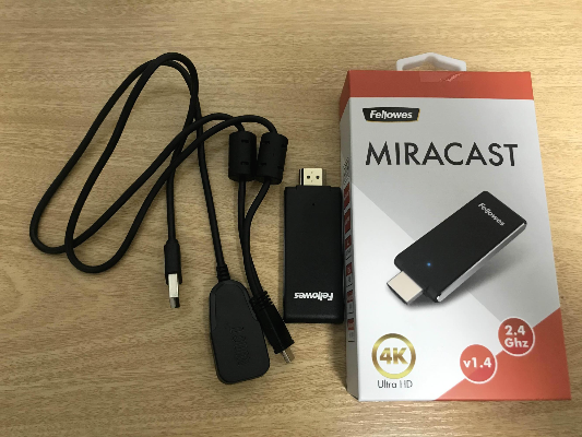 1. HDMI 단자를 연결할 수 있는 모니터에서 핸드폰 영상을 무선으로 미러링 하기 위해 Fellowes 사의 MIRACAST를 구입하였다. 구성품은 아래 사진과 같다.