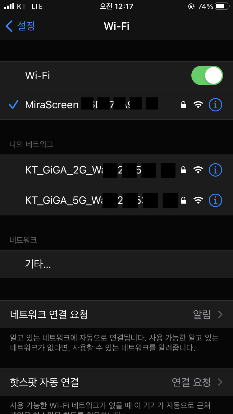 4. 미러링 하고자 하는 핸드폰의 Wi-Fi 검색을 하면 모니터에 출력된 SSID가 검색이 된다.